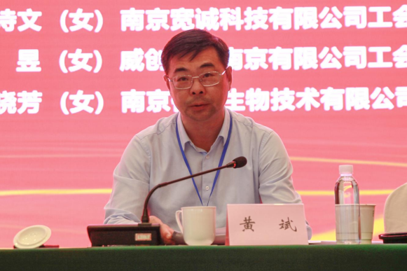 棲霞高新區(qū)黨工委副書記、管委會(huì)主任黃斌為合格職工之家代表頒獎(jiǎng)。
