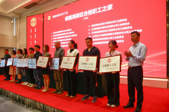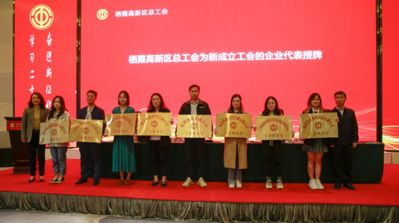 棲霞區(qū)總工會(huì)常務(wù)副主席徐興東,棲霞高新區(qū)黨工委常務(wù)副書記、總工會(huì)主席楊靜,為新成立工會(huì)的企業(yè)代表授牌。