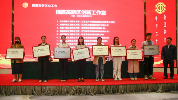 棲霞區(qū)總工會(huì)常務(wù)副主席徐興東為職工創(chuàng)新工作室頒獎(jiǎng)。