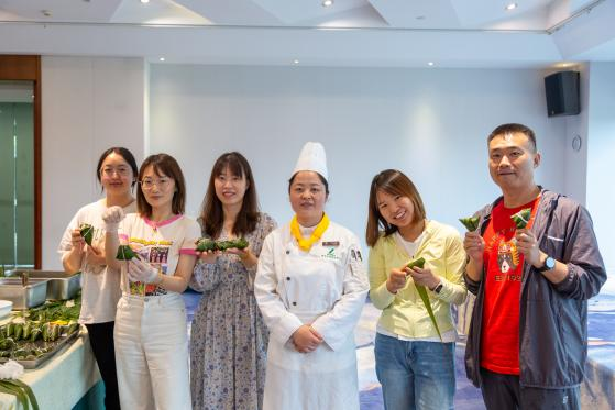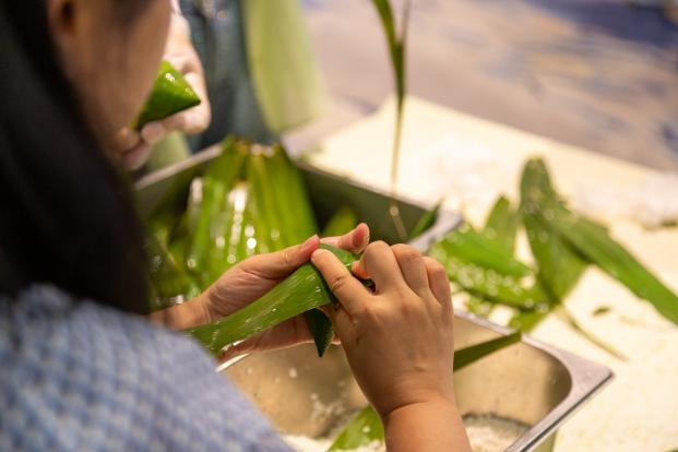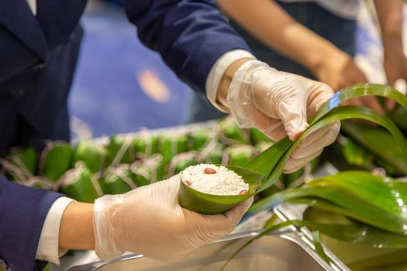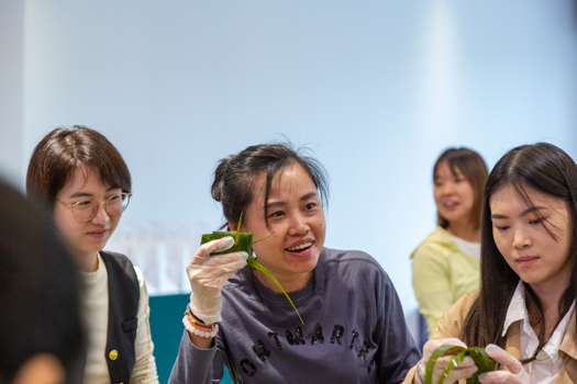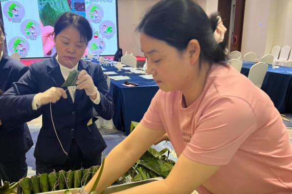 五人一組的包粽子比賽正式開始。選手們摩拳擦掌,拿粽葉、加料、包裹、捆綁,一氣呵成,不一會兒,一片片清香的粽葉,一粒粒晶瑩的糯米,在一雙雙翻飛的巧手下變成了一個個滿載祝福的粽子。“初來乍到”的新手們,經(jīng)過了賽前培訓(xùn)也個個躍躍欲試,手持粽葉手忙腳亂,一會粽葉松了,一會糯米漏了、最后粽繩沒系緊,“翻車”現(xiàn)場讓人忍俊不禁。