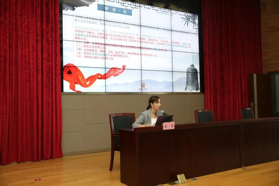 本次會議邀請江蘇彥圣律師事務(wù)所主任律師宗雪作預(yù)防職務(wù)犯罪專題授課。宗雪律師用大量真實(shí)案例展示了職務(wù)犯罪帶來的沉重教訓(xùn),并結(jié)合《中華人民共和國公職人員政務(wù)處分法》進(jìn)行解讀, 參會人員集體觀看了區(qū)紀(jì)委根據(jù)真實(shí)案例改編的警示教育片《不能揩的油》。