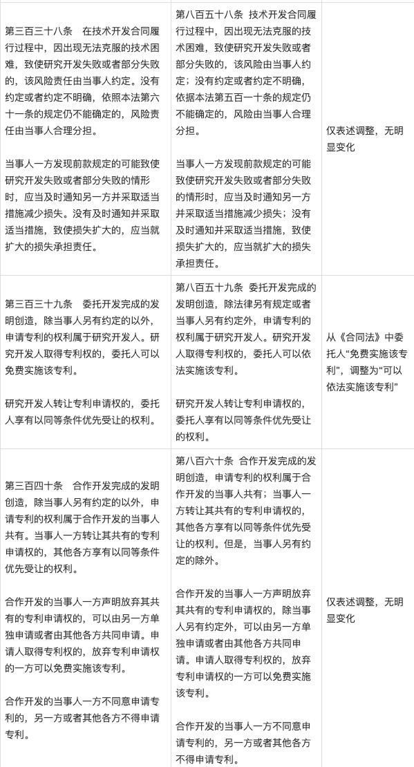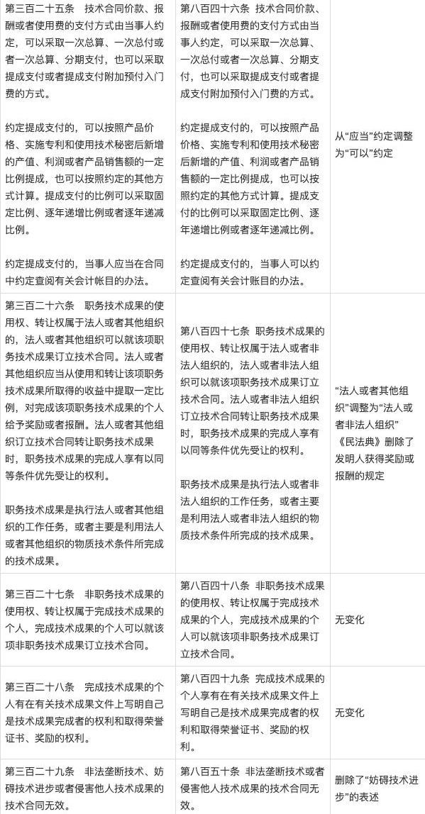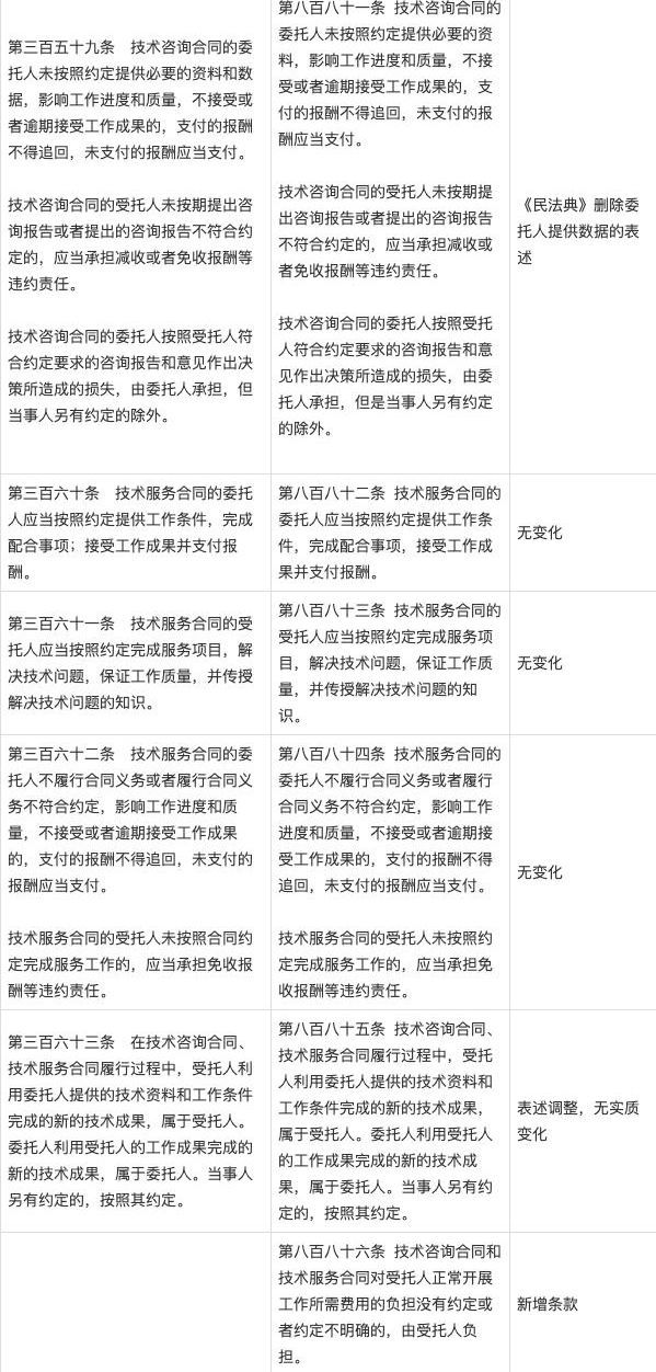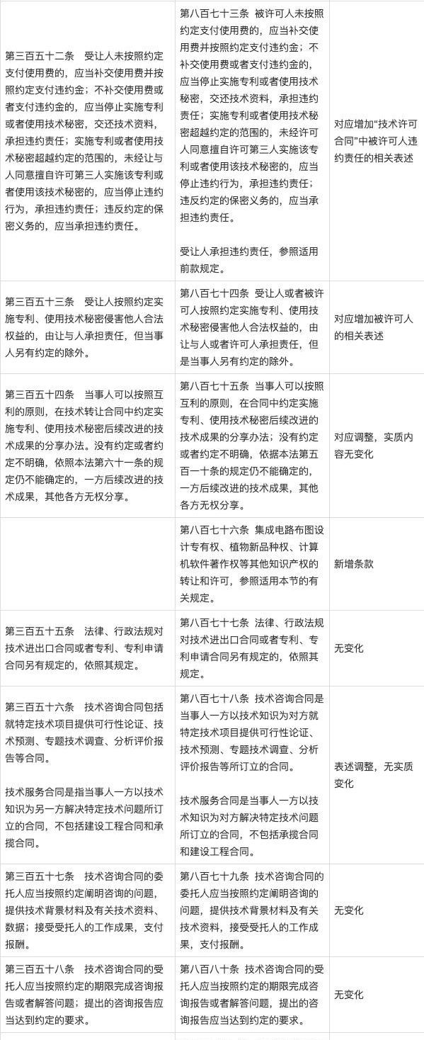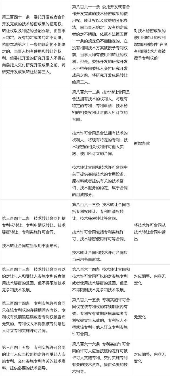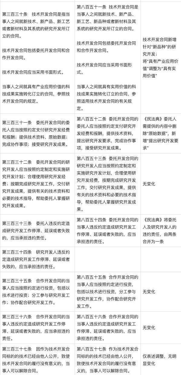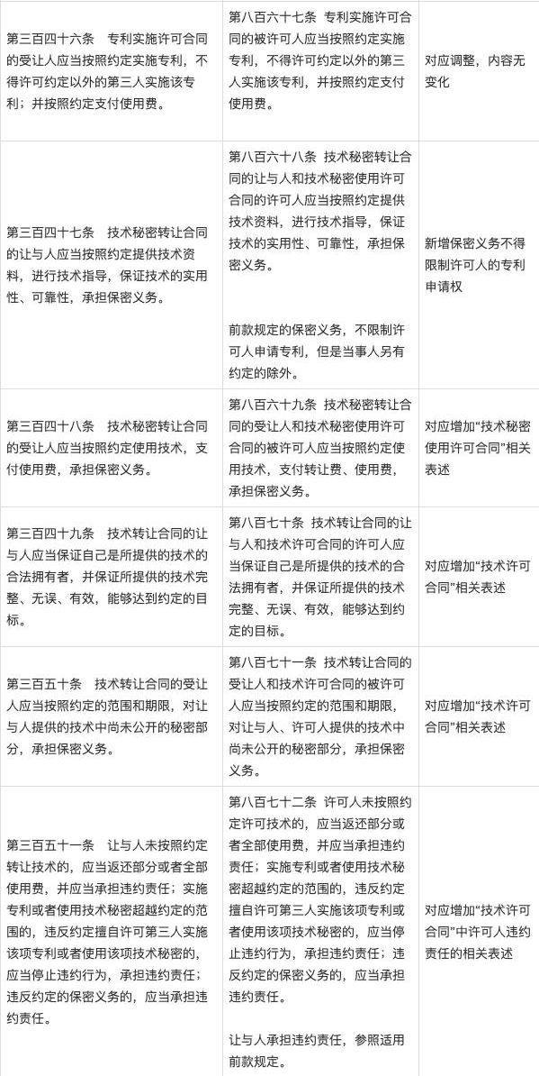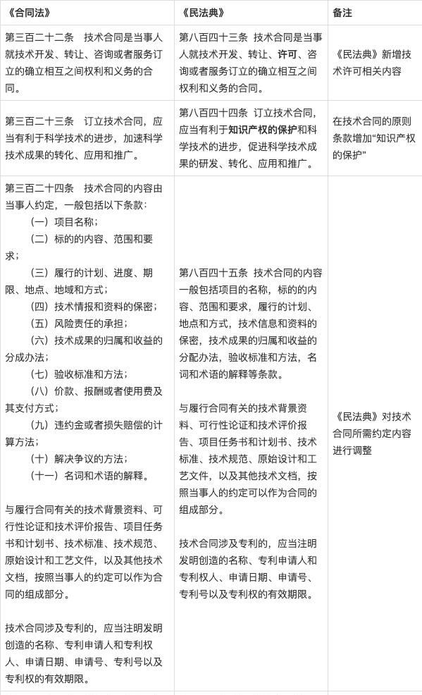2021年1月1日起正式施行的《中華人民共和國民法典》對部分技術(shù)合同條款作了適當(dāng)修改,區(qū)分了技術(shù)轉(zhuǎn)讓合同和技術(shù)許可合同,增加了其他知識產(chǎn)權(quán)的轉(zhuǎn)讓和許可、工作費(fèi)用的負(fù)擔(dān)等條款。高興在此整理了相關(guān)對照表,以供大家參考。
