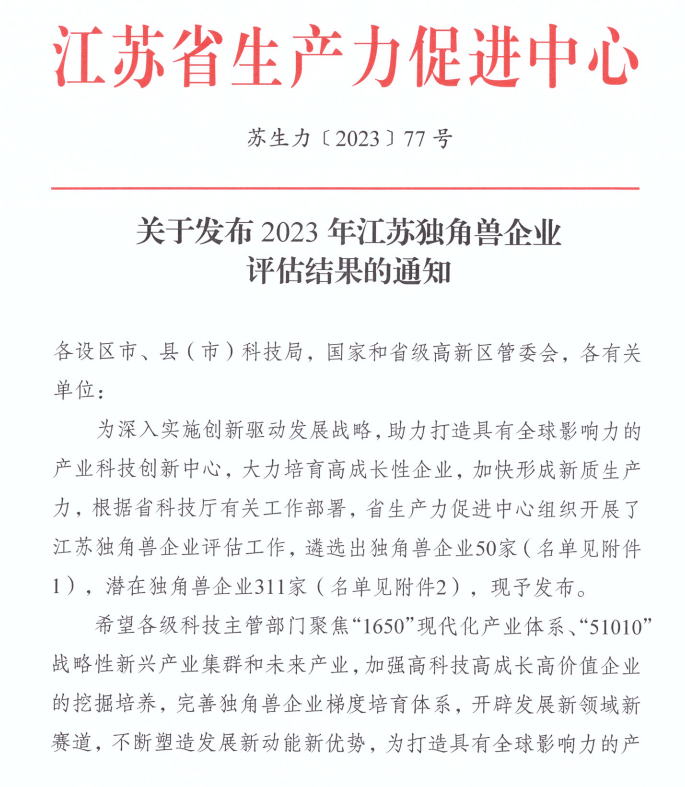 2023年入選江蘇潛在獨角獸和高新區(qū)瞪羚企業(yè)名單