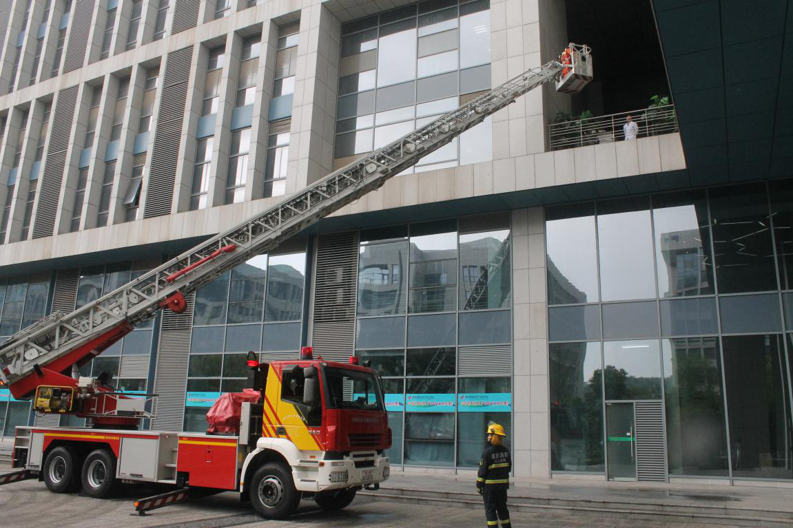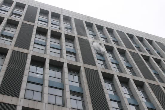 企業(yè)自備滅火器滅火無效,火勢范圍逐步擴大,時間就是生命。高新區(qū)根據(jù)預(yù)案第一時間通過消防廣播通知樓棟人員迅速疏散至樓下集結(jié)點,整個疏散撤離組織有序,秩序井然。經(jīng)現(xiàn)場清點,尚有2名員工未及時撤離,其中1名被困在東側(cè)二層平臺,八樓玻璃已經(jīng)被大火燒裂,情況危急。