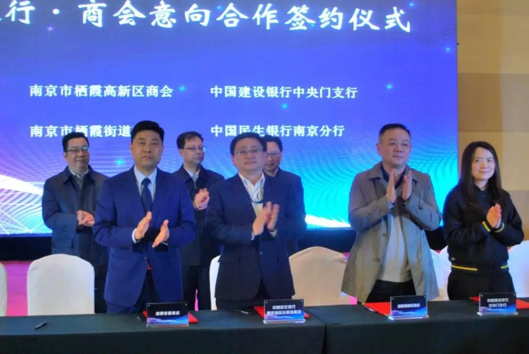 棲霞高新區(qū)企業(yè)服務(wù)處處長、商會(huì)常務(wù)副會(huì)長蔣尚平和中國建設(shè)銀行股份有限公司中央門支行行長、黨委書記羅曼潔簽署高新區(qū)商會(huì)與建設(shè)銀行意向合作協(xié)議。