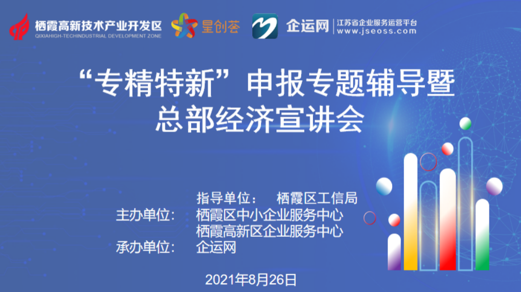 為深入推進“專精特新”企業(yè)培育工程,幫助企業(yè)了解當(dāng)前形勢與企業(yè)轉(zhuǎn)型升級高質(zhì)量發(fā)展思路等問題;同時為穩(wěn)步推動總部經(jīng)濟建設(shè),吸引優(yōu)質(zhì)人才和企業(yè)落地生根,加快形成棲霞高新區(qū)經(jīng)濟發(fā)展新生態(tài),8月26日,棲霞高新區(qū)聯(lián)合棲霞區(qū)工信局、棲霞區(qū)中小企業(yè)服務(wù)中心、企運網(wǎng),線上開展“專精特新”申報專題輔導(dǎo)暨總部經(jīng)濟宣講會,本次活動吸引了120余名企業(yè)負(fù)責(zé)人觀看。