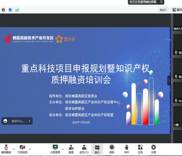 為幫助園區(qū)小微企業(yè)做好項(xiàng)目申報(bào)規(guī)劃及豐富融資渠道,10月26日下午,由棲霞高新區(qū)管委會(huì)指導(dǎo)、高新區(qū)產(chǎn)業(yè)知識(shí)產(chǎn)權(quán)運(yùn)營(yíng)中心主辦、高新區(qū)產(chǎn)業(yè)知識(shí)產(chǎn)權(quán)聯(lián)盟承辦的項(xiàng)目申報(bào)規(guī)劃暨知識(shí)產(chǎn)權(quán)質(zhì)押融資線上培訓(xùn)講座成功舉辦,20余家企業(yè)線上參加此次活動(dòng)。