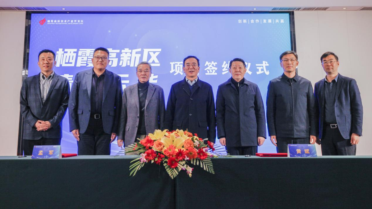 在王承江、郭昌標(biāo)、楊棟、陸永濤、李崢的共同見證下,棲霞高新區(qū)管委會主任黃斌、清陶云能(江蘇)能源科技有限公司董事長孟軍分別代表棲霞高新區(qū)與清陶云能完成簽約。