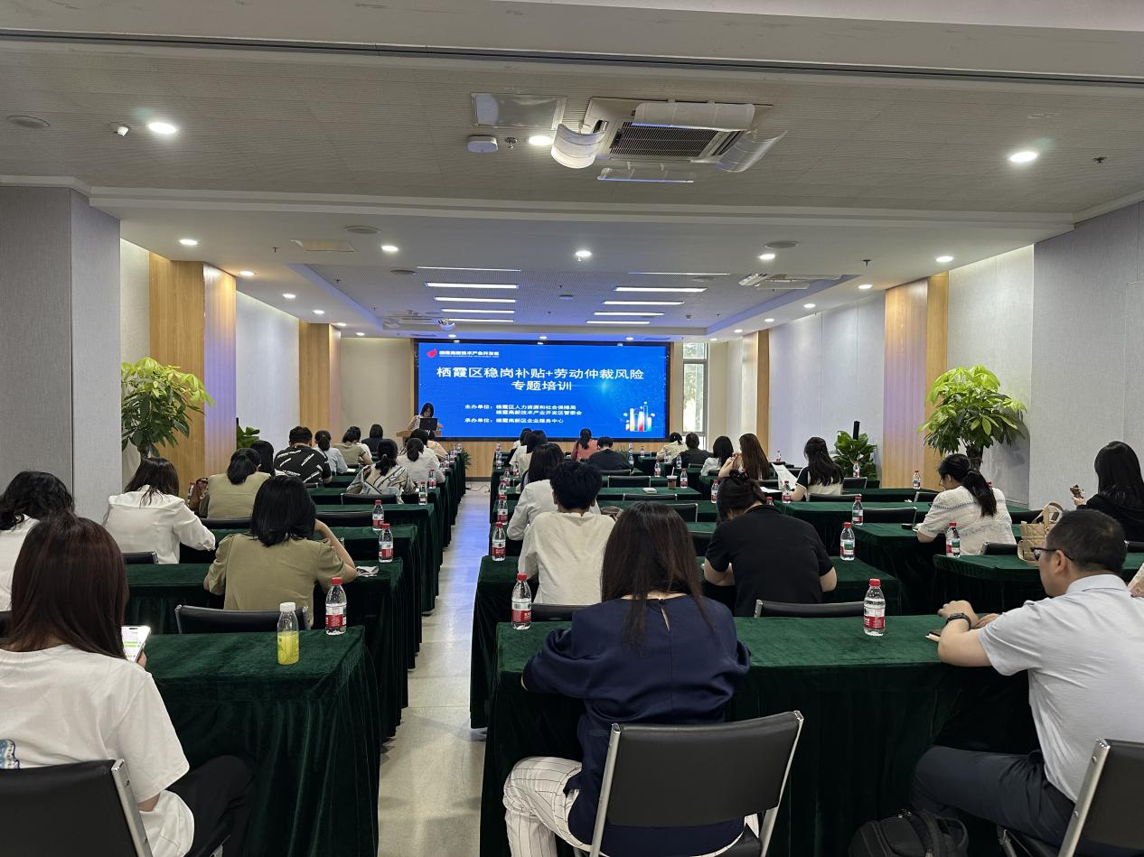 為助力企業(yè)紓困解難、提升勞動用工合規(guī)水平,5月28日,棲霞高新區(qū)聯(lián)合棲霞區(qū)人社局共同舉辦“穩(wěn)崗補貼+勞動仲裁風(fēng)險專題培訓(xùn)”活動。本次活動吸引了園區(qū)內(nèi)40余家企業(yè)代表參與,現(xiàn)場氣氛熱烈。