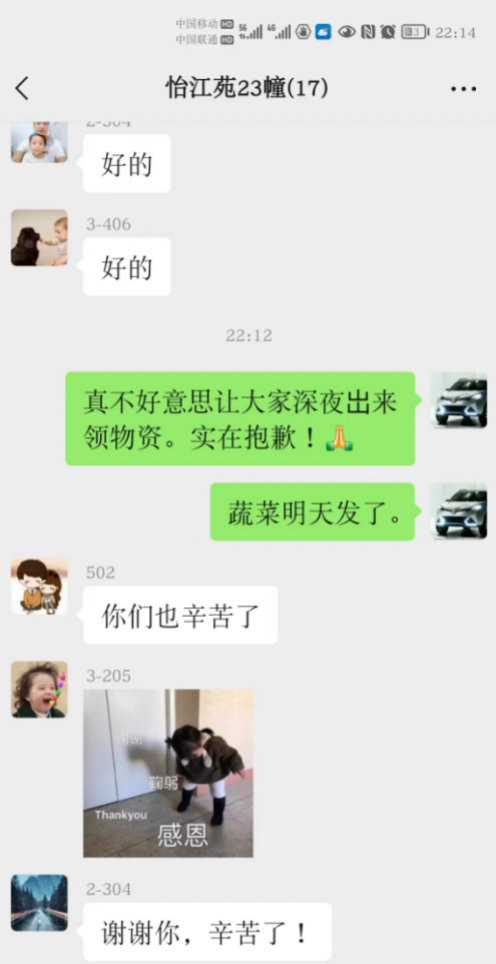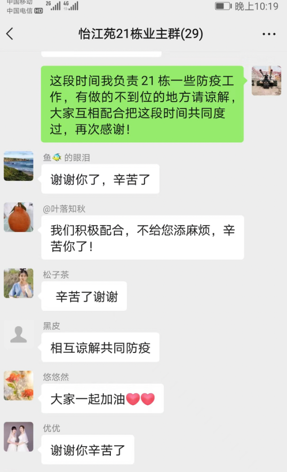 在怡江苑小區(qū)的微信群里,隨手一翻,都能感受到居民對于支援者們濃濃的感激之情。