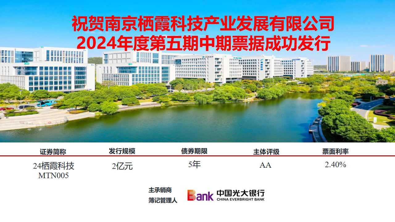 8月21日,南京棲霞科技產(chǎn)業(yè)發(fā)展有限公司在銀行間債券市場成功發(fā)行中期票據(jù)2億元,期限為5年,票面利率2.4%。本次發(fā)行是信用發(fā)行,創(chuàng)棲霞高新區(qū)同期限同品種債券最低利率!