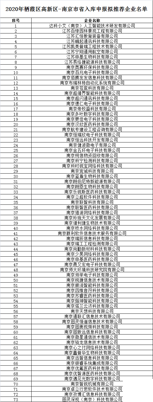 近日,棲霞高新區(qū)73家企業(yè)擬推薦入省高新技術(shù)企業(yè)培育庫(kù)。