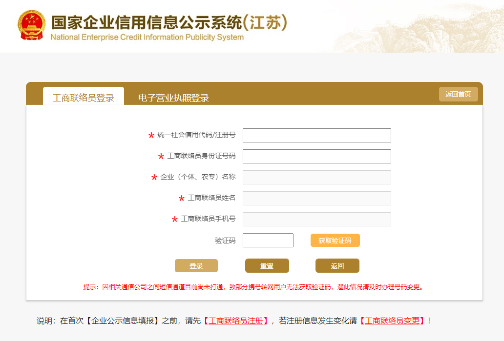 市場(chǎng)主體通過兩種方式登錄公示系統(tǒng)進(jìn)行年報(bào),一種為“工商聯(lián)絡(luò)員”登錄,另一種為電子營業(yè)執(zhí)照登錄。采取“工商聯(lián)絡(luò)員”登錄方式的,如已注冊(cè)過“工商聯(lián)絡(luò)員”,輸入“統(tǒng)一社會(huì)信用代碼/注冊(cè)號(hào)”和“工商聯(lián)絡(luò)員身份證號(hào)”,憑手機(jī)驗(yàn)證碼登錄填報(bào)。未注冊(cè)過“工商聯(lián)絡(luò)員”的企業(yè),需指定一名負(fù)責(zé)本單位年報(bào)公示工作的工商聯(lián)絡(luò)員,先在公示系統(tǒng)按照頁面提示進(jìn)行“聯(lián)絡(luò)員注冊(cè)”,注冊(cè)成功后,憑手機(jī)獲取的驗(yàn)證碼登錄公示系統(tǒng)進(jìn)行年報(bào)。市場(chǎng)主體亦可采用電子營業(yè)執(zhí)照直接登錄。