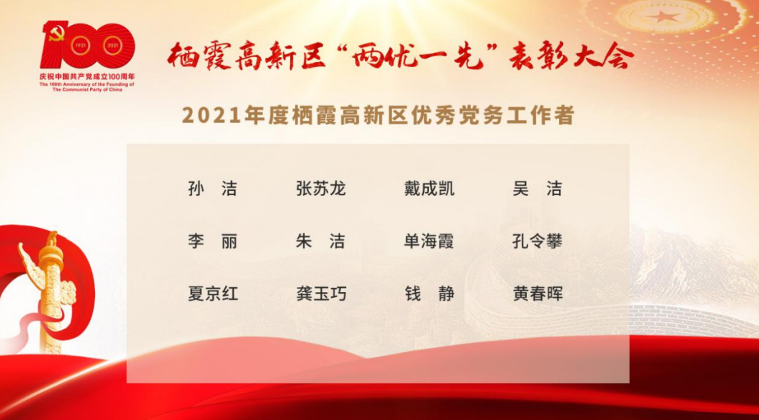 棲霞區(qū)政府辦公室主任王小鋒、高新區(qū)工委常務副書記黃斌為優(yōu)秀黨務工作者頒獎。