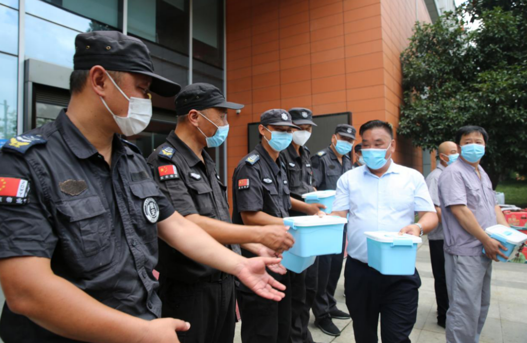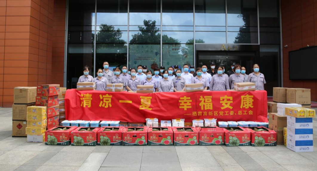活動(dòng)現(xiàn)場(chǎng),棲霞高新區(qū)的慰問(wèn)代表們將一箱箱西瓜、糧油、飲料、方便面、消毒禮盒等暖心物資送到保安、保潔、工程等紫東物業(yè)一線職工手中,給炎炎夏日里仍堅(jiān)守工作崗位的他們帶來(lái)一縷清涼。