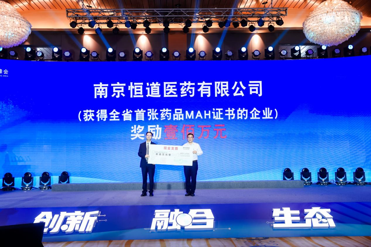 棲霞高新區(qū)生命科技創(chuàng)新園企業(yè),南京恒道醫(yī)藥有限公司,專注于“MAH平臺+項目+技術(shù)創(chuàng)新和轉(zhuǎn)讓”的落地應用,獲批全省首張MAH持有人藥品注冊批件,符合政策第九條的兌現(xiàn)規(guī)定?;顒蝇F(xiàn)場,王生向恒道醫(yī)藥發(fā)放首筆政策扶持資金100萬元,充分表明了棲霞區(qū)對產(chǎn)業(yè)支持的決心和誠心。