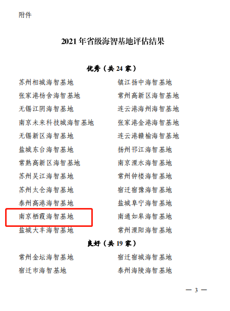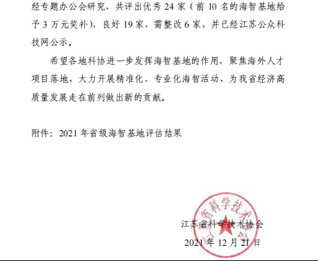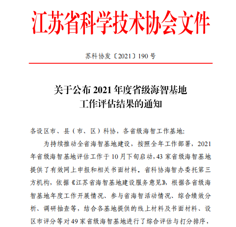近日,江蘇省科協(xié)公布了2021年度省級(jí)海智基地評(píng)估結(jié)果,南京棲霞海智基地在全省43家參評(píng)省級(jí)海智基地中脫穎而出,獲得優(yōu)秀,這是繼2020年之后又一次獲得該項(xiàng)榮譽(yù)。