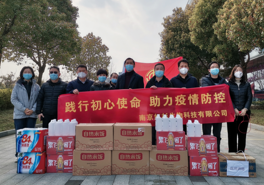 南京紅杉生物科技有限公司捐贈了十幾箱84消毒液、酒精、自熱米飯;