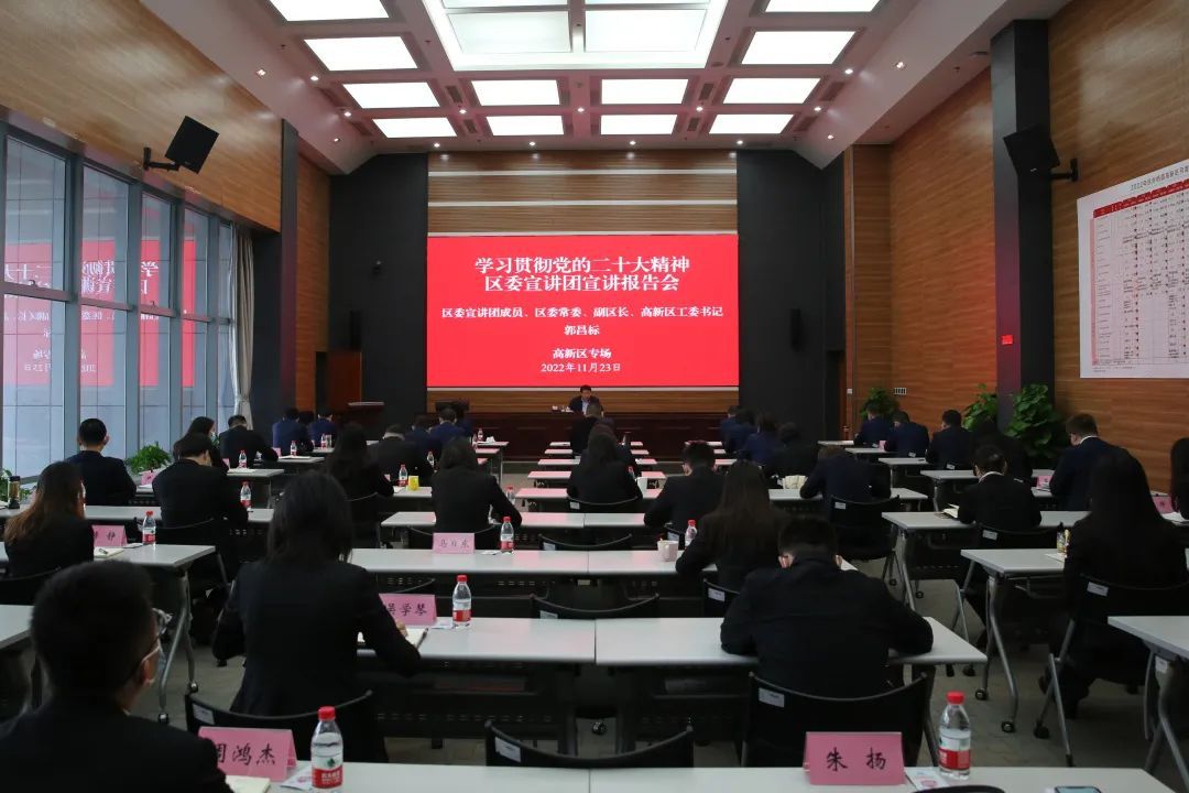 11月23日,棲霞高新區(qū)召開學(xué)習(xí)貫徹黨的二十大精神宣講報(bào)告會(huì),區(qū)委宣講團(tuán)成員、區(qū)委常委、副區(qū)長(zhǎng)、高新區(qū)黨工委書記郭昌標(biāo)作專題宣講,高新區(qū)班子領(lǐng)導(dǎo)、各部門科長(zhǎng)以上干部、各子公司黨政負(fù)責(zé)人參加,高新區(qū)黨工委常務(wù)副書記楊靜主持會(huì)議。