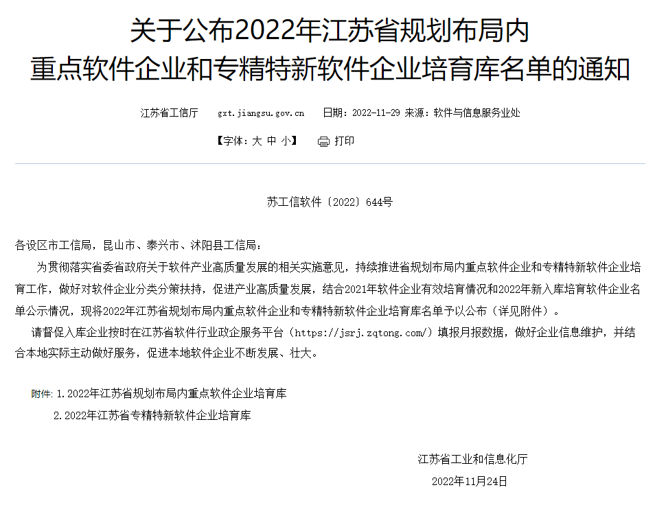 日前,江蘇省工業(yè)和信息化廳發(fā)布《關(guān)于公布2022年江蘇省規(guī)劃布局內(nèi)重點軟件企業(yè)和專精特新軟件企業(yè)培育庫名單的通知》,園區(qū)3家企業(yè)入選江蘇省專精特新軟件企業(yè)培育庫。