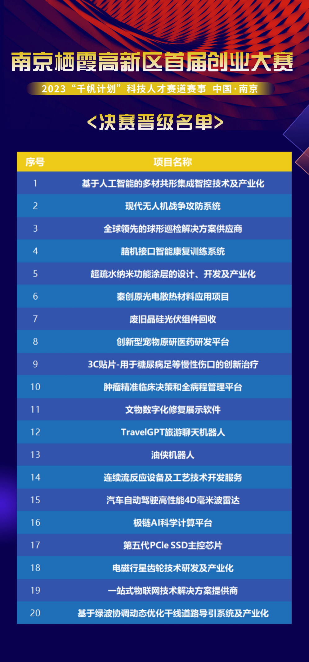 2023南京棲霞高新區(qū)首屆創(chuàng)業(yè)大賽“千帆計(jì)劃”科技人才賽道賽事決賽暨頒獎(jiǎng)典禮將于2023年4月13日(周四)在南京舉行。為了促進(jìn)人工智能、生命健康等主導(dǎo)產(chǎn)業(yè)的集聚和發(fā)展,挖掘優(yōu)質(zhì)人才和項(xiàng)目,激發(fā)創(chuàng)業(yè)人才落地棲霞高新區(qū)的熱情,從上海、南京、西安三個(gè)賽區(qū)遴選出57個(gè)項(xiàng)目晉級(jí)半決賽,最終選拔出20個(gè)項(xiàng)目爭(zhēng)奪總決賽席位。決賽現(xiàn)場(chǎng)將舉辦頒獎(jiǎng)典禮,并簽約落地項(xiàng)目,發(fā)布大企業(yè)需求。參賽項(xiàng)目涵蓋人工智能、機(jī)器人、智能制造裝備、生物醫(yī)藥等前沿技術(shù),賦能于工業(yè)、金融、醫(yī)療、企業(yè)服務(wù)等諸多行業(yè)。決賽晉級(jí)名單如下: