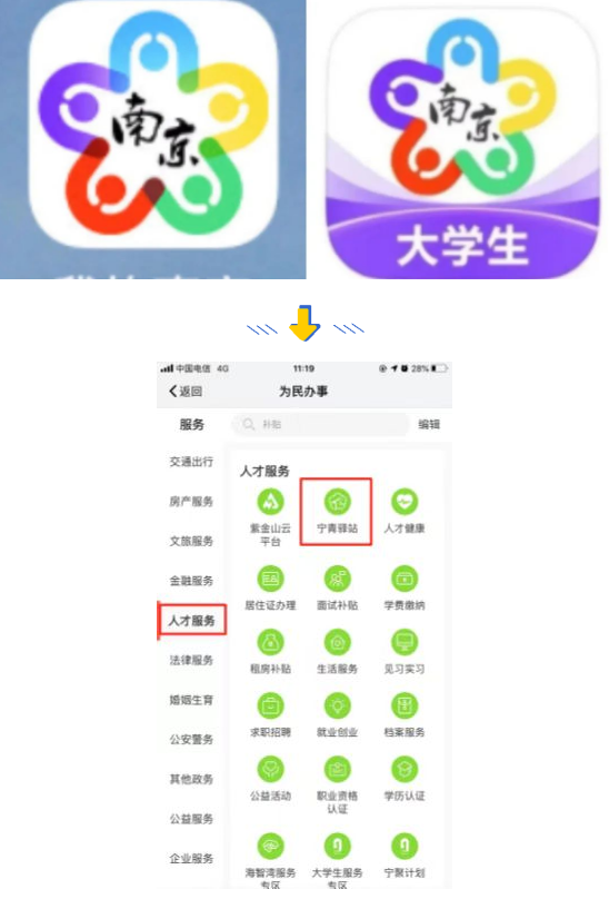 下載“我的南京”或者“南京大學(xué)生版”app,進(jìn)入首頁(yè)點(diǎn)擊“寧青驛站”。