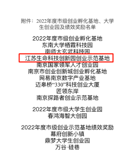 近日,江蘇生命科技創(chuàng)新園成功入選2022年度市級(jí)創(chuàng)業(yè)示范基地。