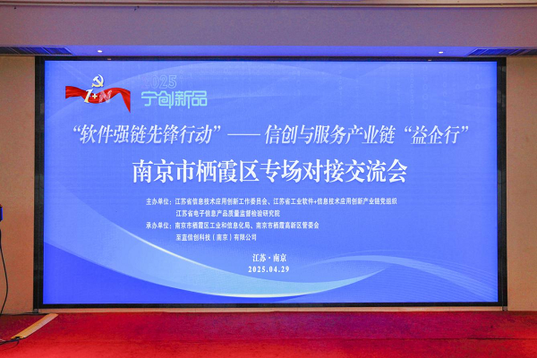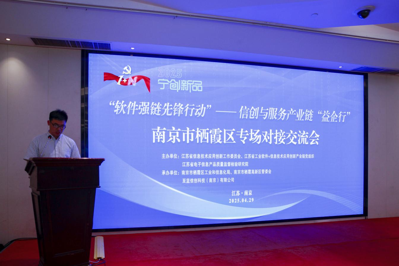 2025年4月29日下午,“寧創(chuàng)新品”板塊行——“軟件強(qiáng)鏈先鋒行動(dòng)”信創(chuàng)與服務(wù)產(chǎn)業(yè)鏈“益企行”南京市棲霞區(qū)專場對接交流會在紫東生態(tài)會議中心成功舉辦?;顒?dòng)由江蘇省信息技術(shù)應(yīng)用創(chuàng)新工作委員會、江蘇省工業(yè)軟件+信息技術(shù)應(yīng)用創(chuàng)新產(chǎn)業(yè)鏈黨組織、江蘇省電子信息產(chǎn)品質(zhì)量監(jiān)督檢驗(yàn)研究院主辦,南京市棲霞區(qū)工業(yè)和信息化局、棲霞高新區(qū)管委會、至藍(lán)信創(chuàng)科技(南京)有限公司聯(lián)合承辦。省工信廳軟件與信息服務(wù)業(yè)處一級調(diào)研員康成剛、省國家密碼局科技處二級調(diào)研員沈道鑒、省衛(wèi)健委規(guī)劃發(fā)展與信息化處二級主任科員韋小強(qiáng)、市工信局軟件與信息服務(wù)業(yè)處處長鄭煒、市國家密碼局科技發(fā)展處處長丁志斌、市數(shù)據(jù)局?jǐn)?shù)字基礎(chǔ)設(shè)施和數(shù)字科技處副處長杜忠焱、棲霞區(qū)工信局局長余蓉、棲霞高新區(qū)黨工委常務(wù)副書記楊靜等省、市、區(qū)領(lǐng)導(dǎo),以及50余家信創(chuàng)骨干企業(yè)及用戶單位出席本次活動(dòng),共商信創(chuàng)產(chǎn)業(yè)發(fā)展新路徑。本次會議由省信創(chuàng)工委會信創(chuàng)測試中心主任王坤主持。